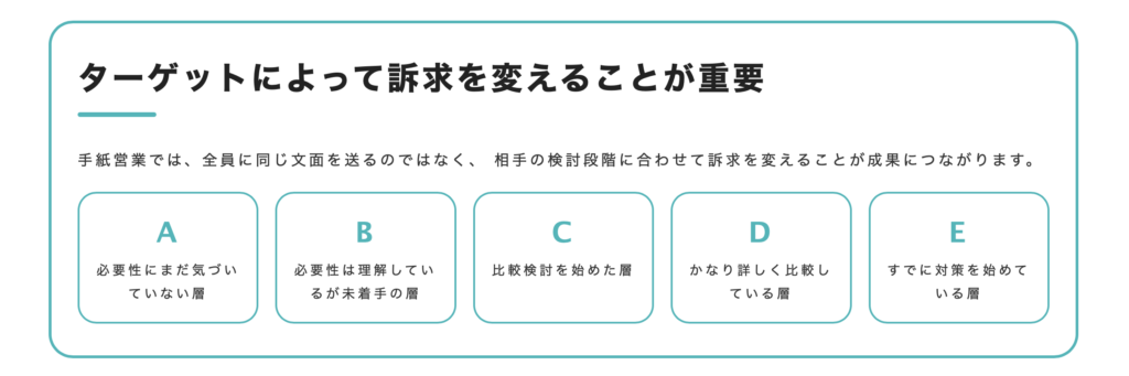 2. 文章構成:心理学に基づいたコピーライティング 受取人の業界・課題に合わせたパーソナライズ文章で、「自分のために書かれた手紙」だと感じさせます。