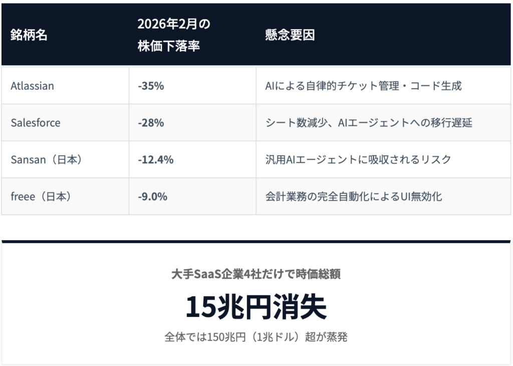 市場は震撼した。「月額3,000円程度のAIが、企業が数千万円をかけて導入してきたSaaSを代替できる」——その恐怖が、一斉売りを招いた。