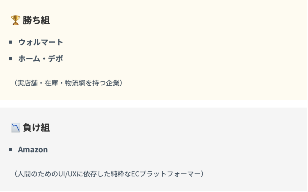 ウォルマートの強みは「実店舗を物流拠点として活用するフルフィルメント戦略」にある。AIエージェントが発注しても、最終的にモノを届ける物理的なインフラを持つ企業が勝つ——それがAI時代の逆説だ。