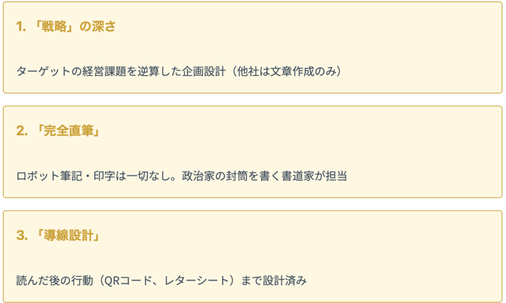 - 競合との差別化:メール・電話が飛び交う中、手書き手紙で「記憶に残る」