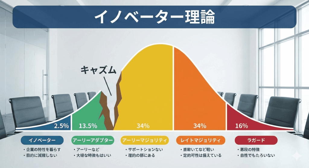 イノベーター理論とは、アメリカの社会学者エベレット・M・ロジャーズが提唱した理論で、