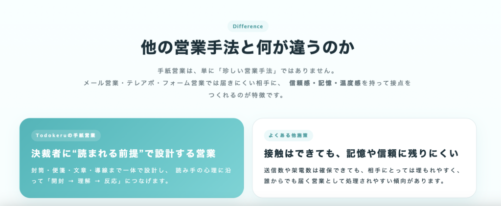 「一般的な手紙営業」では差別化が難しくなっています。(todokeru-letter.com)