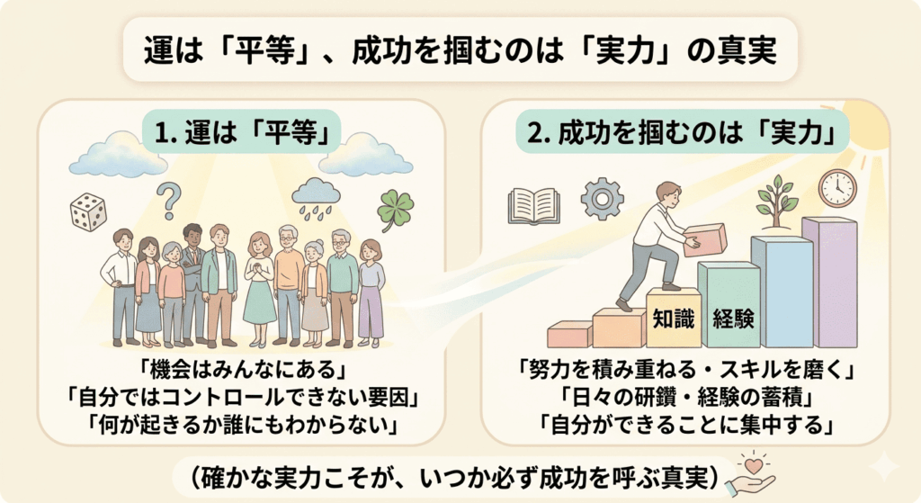 この言葉は、一見すると運の要素が成功の大部分を占めるように聞こえますが、その真意は、運の公平性と実力の重要性を深く洞察したものです。